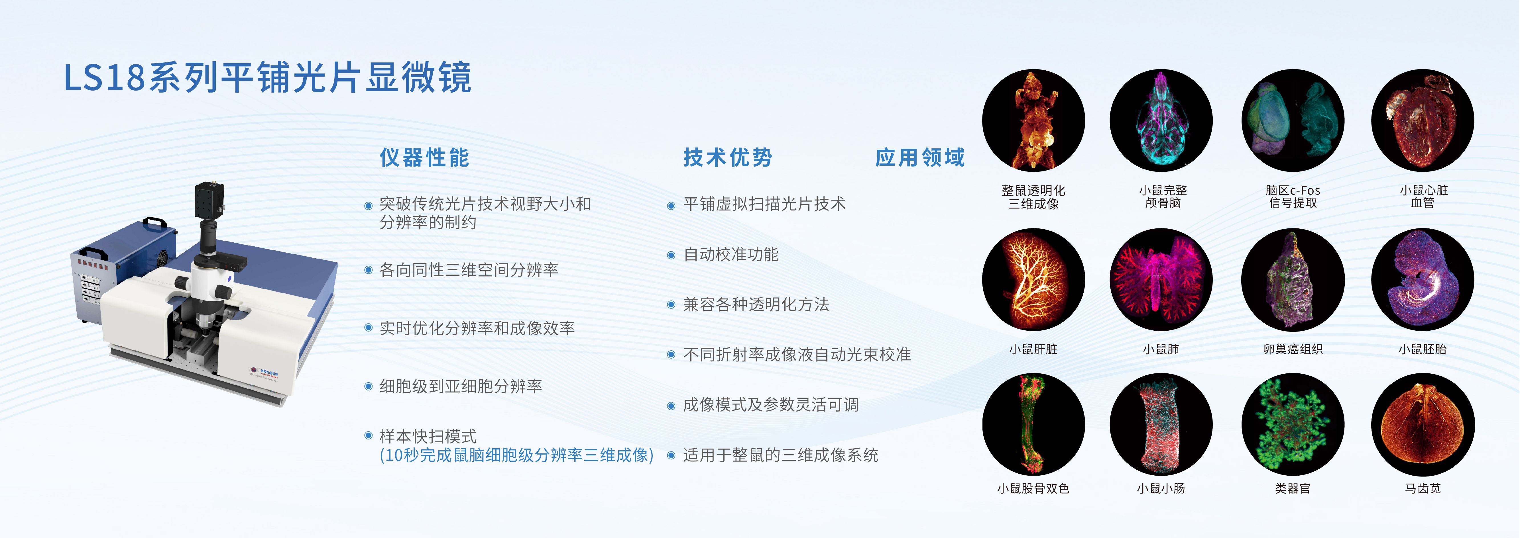 广泛应用于脑和神经科学、肿瘤与免疫、胚胎发育、皮肤、泌尿与生殖、消化与吸收、骨科、生物仿生学等生命科学研究及药筛药物评价。并提供一站式定制化生物组织透明化3D成像及数据分析CRO服务公司,产品和技术得到全国270多家生命科学领域高校、科研院所、医院的认可。