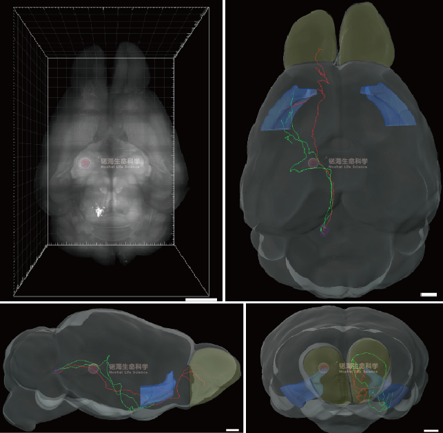 With the development of imaging technology , neuroscience researchers are able to image the whole brain with desired spatial resolution, from micrometer even to nanometer, which provide the opportunity for scientists to study the connection and projection of various types of neurons in different brain regions. Nuohai Life Science provides systematic brain 3D imaging data analysis service platform ---- visualization of the 3D brain, mouse brain Atlas alignment, segmentation and cell counting of interested target brain regions according to mouse Brain Atlas.